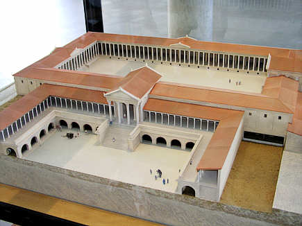 Modell des Forums mit Portiken. Im Vordergund der später errichtete nördliche Portikus, von dessen bestimmendem Gebäude noch Reste an der Place du Forum sichtbar sind.